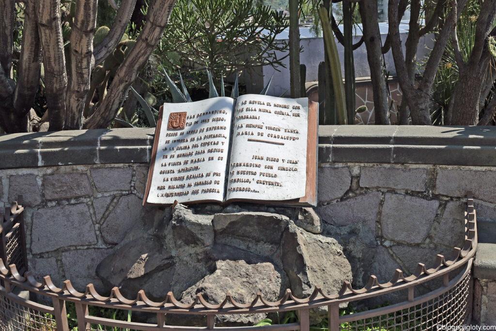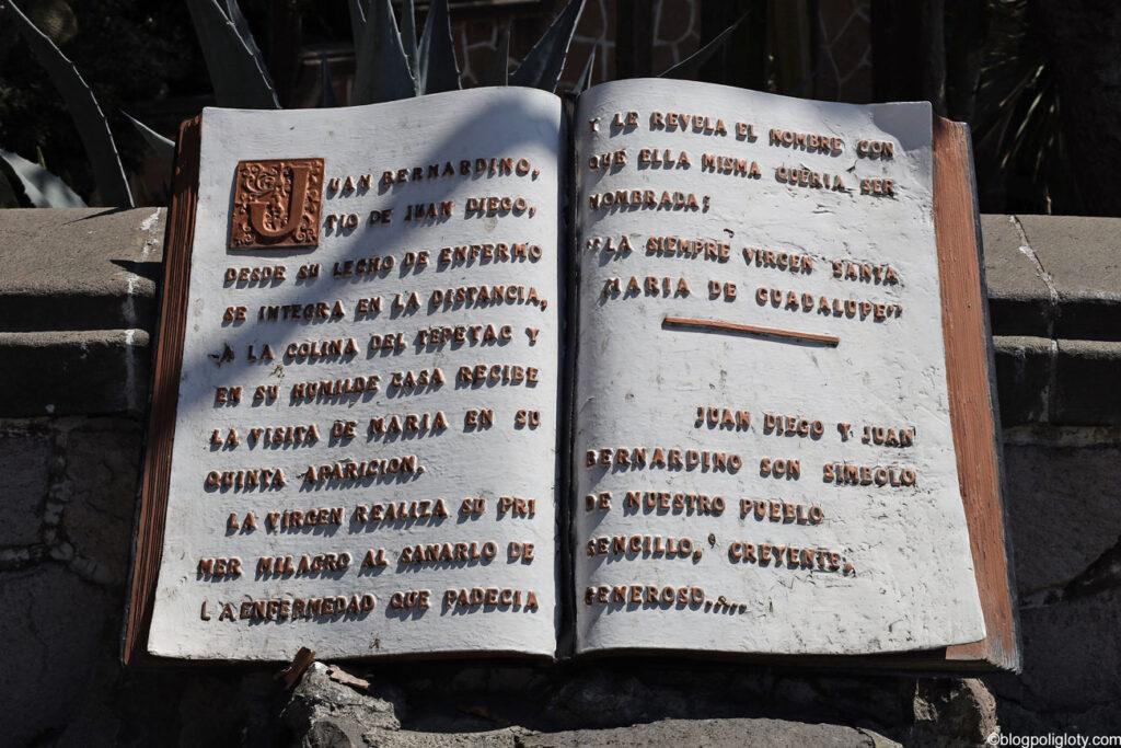 Rzeźba w postaci otwartej księgi, znajdująca się na terenie sanktuarium Matki Bożej z Guadalupe w Meksyku, jest jednym z elementów upamiętniających postacie związane z objawieniami Matki Bożej z Guadalupe. Księga jest symbolem przekazu i historii, które zostały zapisane na kartach czasu, a jej otwartość ma oznaczać dostępność wiedzy i nauki dla wszystkich, którzy pragną poznać prawdę o tych wydarzeniach.