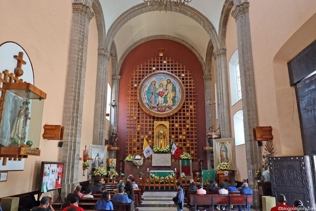 Frente a la entrada de la capilla, en el lado sur, se encuentra un hermoso altar mayor de estilo barroco. En su lugar central está una copia de la imagen de la Virgen de Guadalupe, realizada por el famoso pintor Miguel Cabrera, mientras que las cuatro paredes laterales de la capilla están decoradas con cuadros de este mismo artista, que representan las distintas apariciones. El techo de la cúpula está adornado con frescos de estilo bizantino, realizados por José Salomé Piña, un artista que fue maestro del célebre muralista mexicano Diego Rivera (quien decoró los interiores del Palacio Presidencial en el Zócalo de la Ciudad de México con murales que narran la historia de México). A la derecha del altar se encuentra un púlpito de madera ricamente tallado, sostenido por una figura que recuerda a Juan Diego. En una de las paredes, hay un ataúd de vidrio que alberga una figura de la Virgen a tamaño natural; bajo el ataúd se encuentra la inscripción „Dormición de la Virgen”.