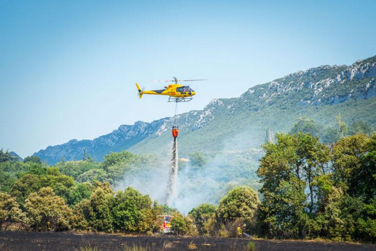 Photo : Hélicoptère larguant de l’eau © Sapeurs-Pompiers – SDIS 66, Perpignan