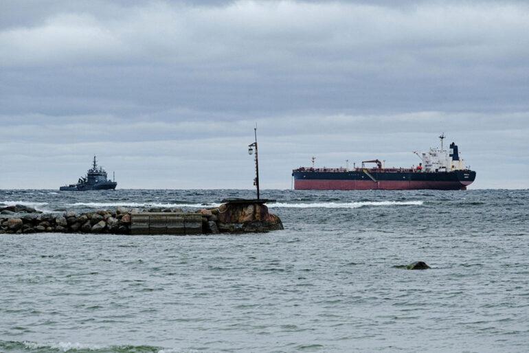 Foto: El petrolero Kiwala, sin bandera nacional válida, detenido por la Marina de Estonia en el Golfo de Finlandia el 11 de abril de 2025 (foto: Priit Mürk)
