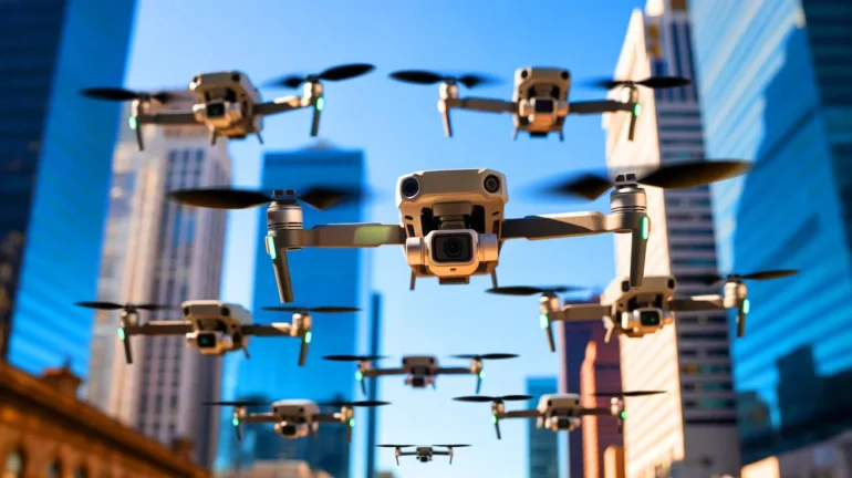 | Rój dronów zbliża się z północy, poruszając się w zorganizowany sposób i utrzymując zwartą formację. | Un essaim de drones approche du nord, se déplaçant de manière organisée et maintenant une formation compacte. |