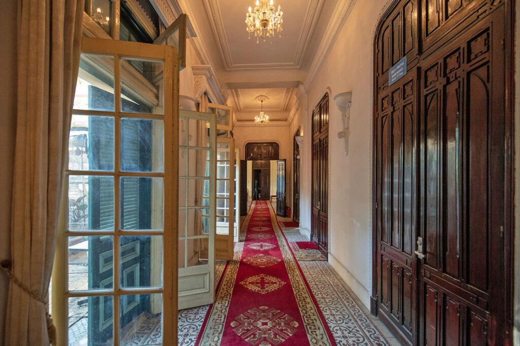 Le couloir du palais est élégant et spacieux, avec un tapis rouge qui s’étend sur le sol, bordé de carreaux de céramique décoratifs. Les portes en bois sombre et les fenêtres à volets offrent une vue sur l’extérieur, tandis que des lustres en cristal illuminent l’ensemble de l’espace, créant une atmosphère à la fois majestueuse et intime. Le style du palais illustre la volonté de combiner les principes du classicisme européen avec des éléments adaptés au climat tropical du Vietnam : hauts plafonds, galeries ombragées et larges fenêtres favorisant la circulation de l’air.