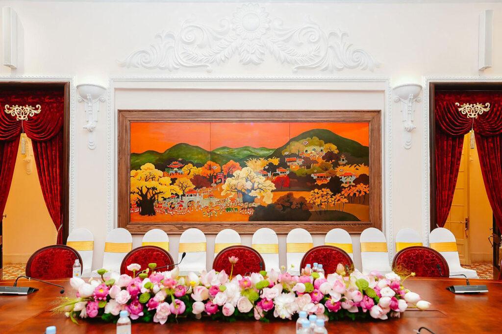 L’intérieur du palais a été préservé dans son style classique français, tout en restant imprégné de l’esprit vietnamien, notamment grâce au tapis orné de motifs « thuỷ ba » (vagues d’eau) datant de la dynastie des Nguyễn.