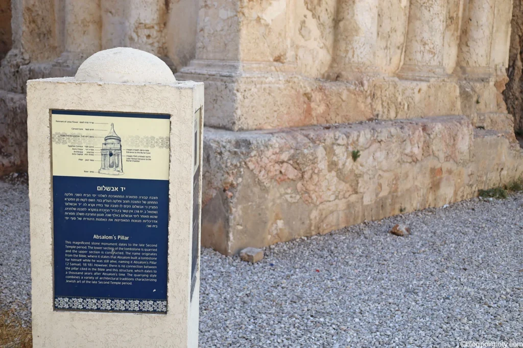 Absalom’s Pillar is about 20 metres tall. The monument stands on a square base and is made of two main parts. The lower part was carved directly out of the rock of the Mount of Olives, while the upper part, which rises above the natural rock, was built from carefully cut stone blocks.